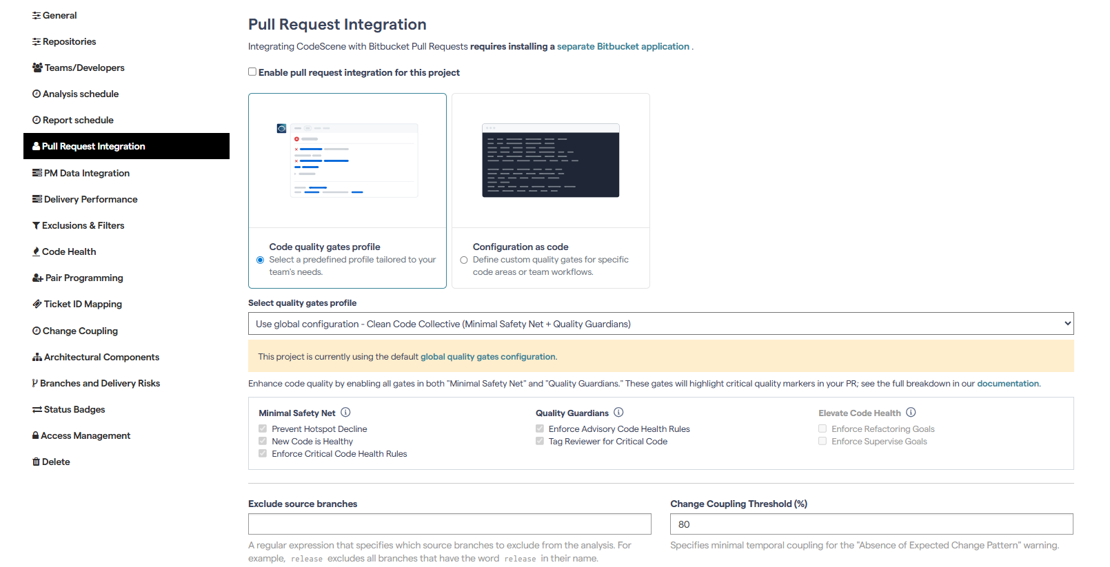 This is where you’ll set up how CodeScene communicates with Bitbucket and defines the analysis behavior for incoming Pull Requests.
